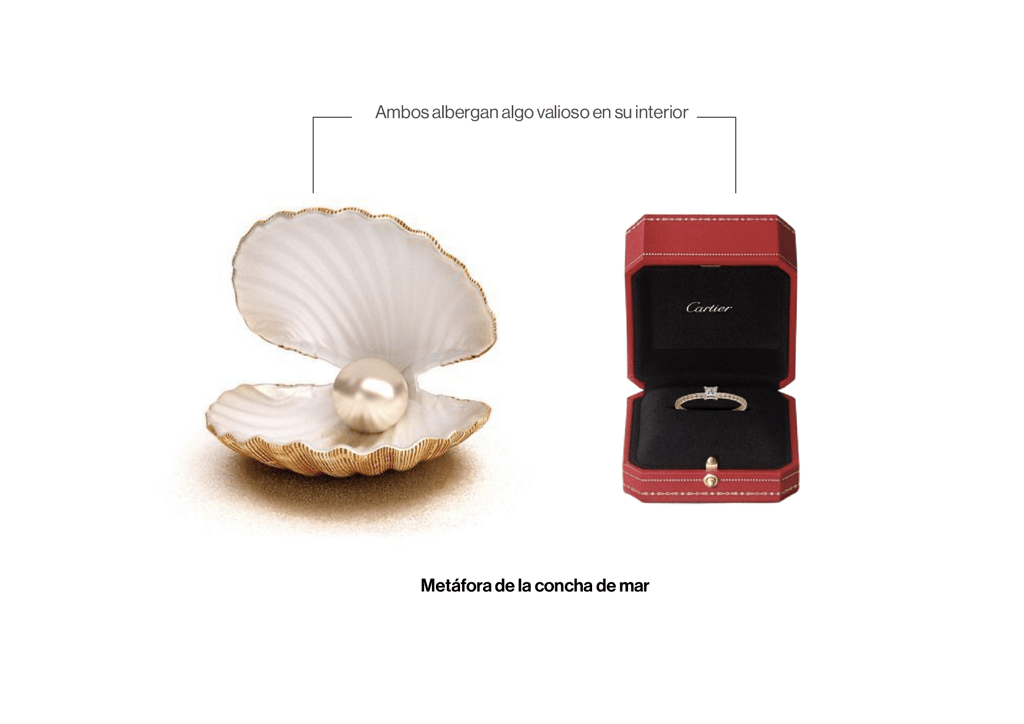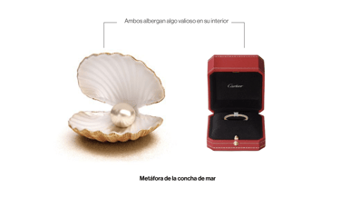 Bajo una metáfora que une una concha de mar que alberga una perla y un cofre con un anillo de compromiso, ambos elementos representan la protección y el valor de su contenido.